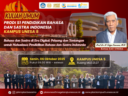 UNESA 5 Campus, October 6, 2025 — The Indonesian Language and Literature Education Study Program(PBSI) of Campus 5, Universitas Negeri Surabaya (Unesa), held a public lecturethemed “Language and Literature in the Digital Era: Opportunities andCha