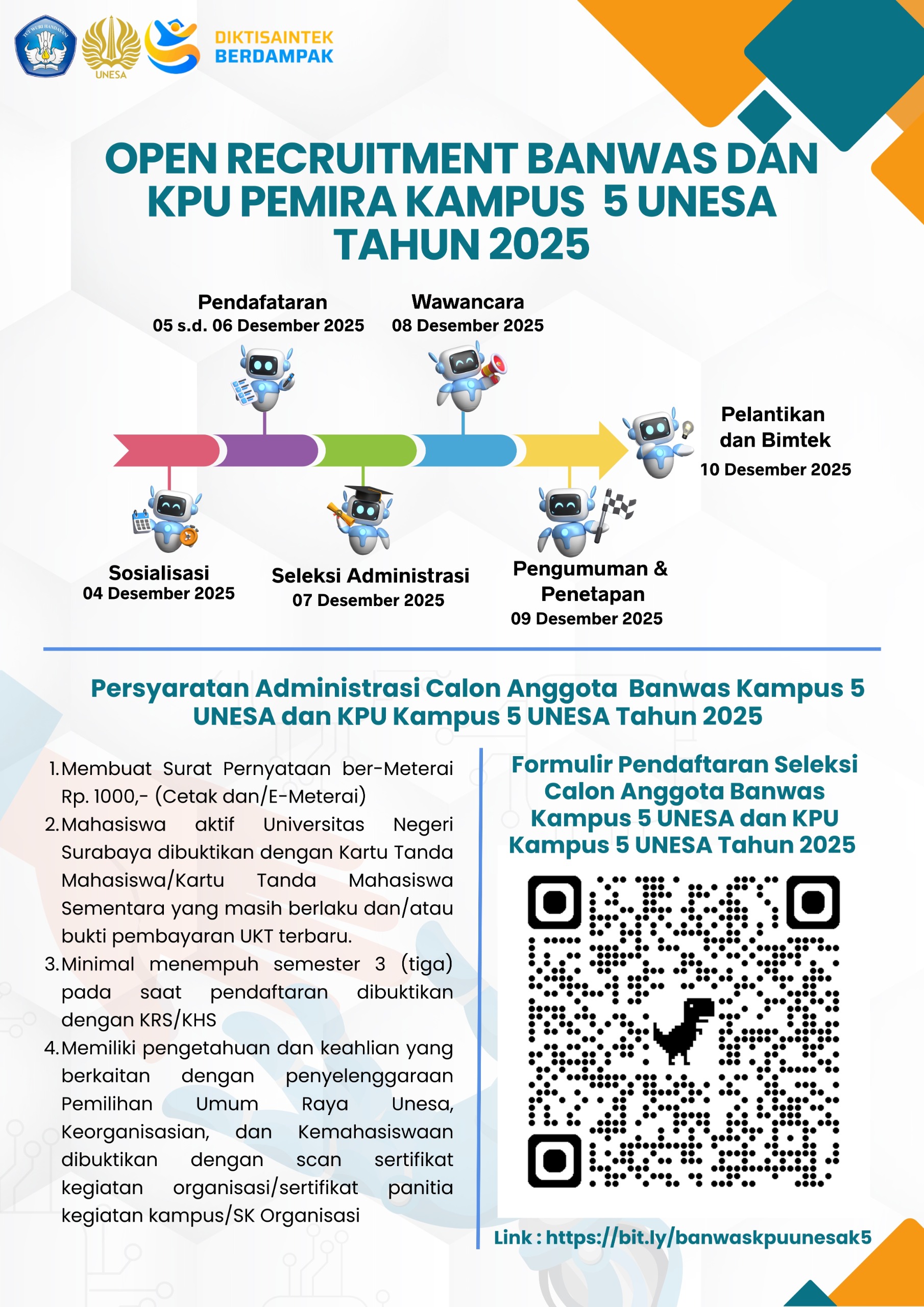 Surabaya, 4 Desember 2025 – Kampus5 Universitas Negeri Surabaya dengan ini membuka pendaftaran untuk CalonAnggota Badan Pengawas dan Komisi Pemilihan Umum Pemilihan Umum Raya Periode2025.Kegiatan ini bertujuan untukmembentuk kepengurusan yang indep