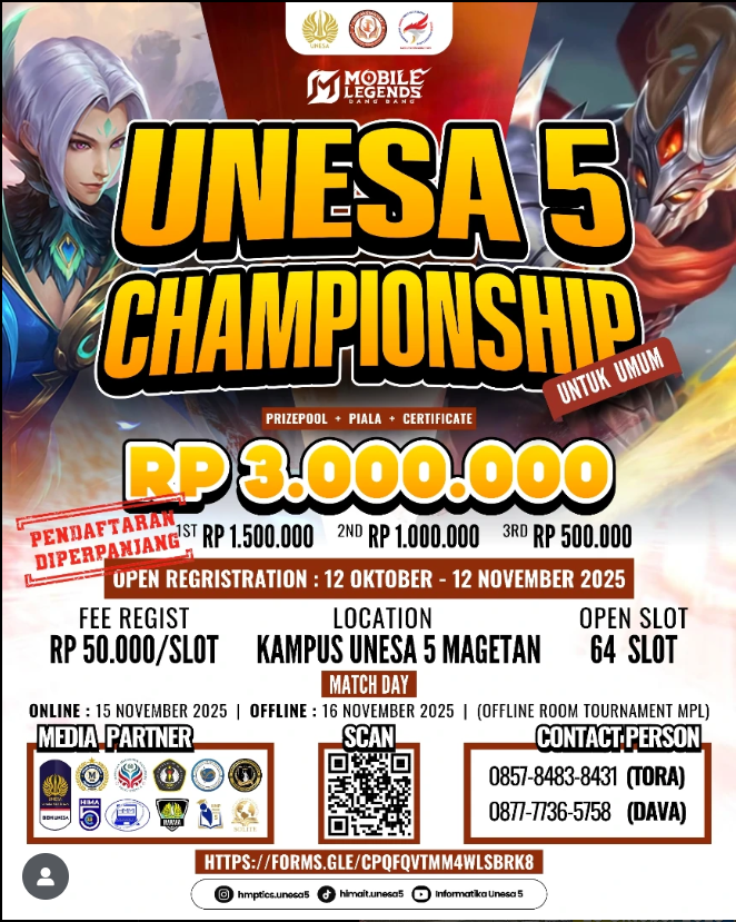 Magetan, November 6, 2025 — The Student Association of the Informatics Study Program at Universitas Negeri Surabaya Campus 5 Magetan proudly presents the UNESA 5 CHAMPIONSHIP, an exciting Mobile Legends: Bang Bang tournament open to the public, off