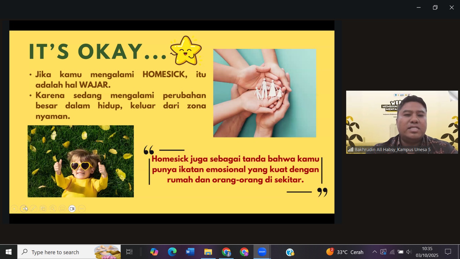 In the second session, Dr. Bakhrudin Al Habsy,M.Pd., as Coordinator of UNESA Campus 5 Counseling Services, discussed thecommon challenges faced by new students, such as homesickness and cultureshock. He emphasized the importance of mutual respect and building broad socialnetworks.